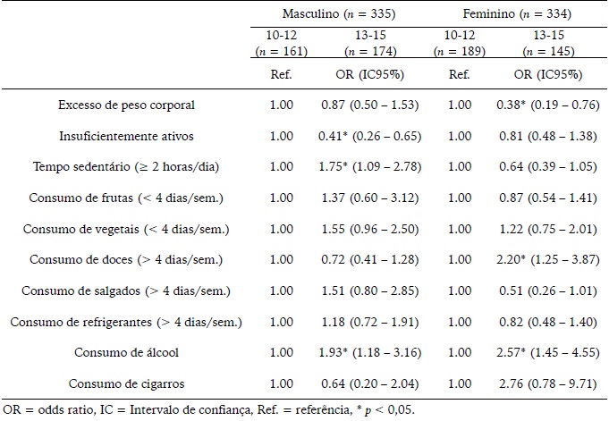 Nos rapazes, verificou-se que os escolares entre 10 e 12 anos de idade apresentaram maior proporção de insuficientemente ativos quando comparados aos seus pares entre 13 e 15 anos (X2 = 13.458; p < .05). Em contrapartida, escolares da faixa etária entre 13 e 15 anos apresentaram maior proporção de permanência em atividades sedentárias por mais de duas horas ao dia (X2 = 4.035; p < .05) e consumo de bebidas alcoólicas (X2 = 8.136; p < .05). As meninas com idades entre 10 e 12 anos apresentaram maior proporção de excesso de peso corporal em comparação aos seus pares entre 13 e 15 anos (X2 = 8.644; p < .05). Por outro lado, as meninas mais velhas (13 e 15 anos) apresentaram maiores proporções do consumo de doces em quatro ou mais dias da semana (X2 = 8.425; p < .05), de bebidas alcoólicas (X2 = 15.708; p < .05) e de cigarros (X2 = 7.968; p < .05) em comparação às meninas mais novas (10 e 12 anos).