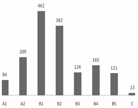 From 2007 to 2009, there was an average of approximately 19.5 articles per researcher, out of a total of 1562 articles published. This corresponds to approximately seven articles annually per researcher. Figure 1 shows the publications according to criteria for the classification of scientific journals adopted by Capes.