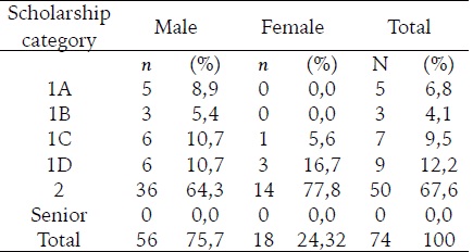The research fellows of CNPq in Physical Education comprised 74 individuals. There was a predominance of male fellows, 56 researchers (75.7%), compared to only 18 female researchers (24.3%). Table 1, shows that, regardless of gender, there was a predominance of fellows in category 2, which denotes researchers with at least three years of conclusion of the doctorate at the implementation of the scholarship. There were no female researchers in categories 1A and 1B. In all categories, there were higher numbers of male researchers.