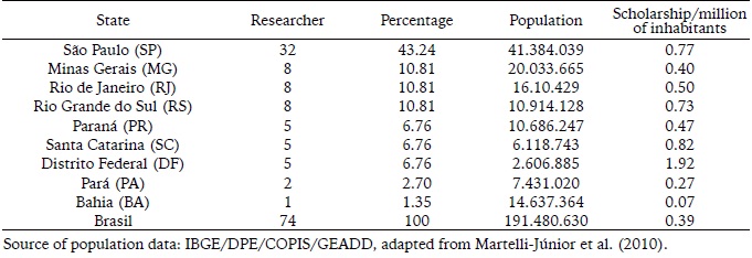 Table 2 shows that the researchers are distributed in nine states of the federation, and that São Paulo has the largest number (43.2%). It also shows that the southern-eastern states (São Paulo, Minas Gerais and Rio de Janeiro) and Rio Grande do Sul host most of the research fellows in Physical Education (76%). The analysis of the ratio of number of scholarships in the area of Physical Education of CNPq per capita shows a national average of 0.39 fellows per million people. After analysis of each state, it is observed that the Federal District, with 1.92 scholarships per million people, is well above average. Also above average are the states of Santa Catarina (0.82), Rio Grande do Sul (0.73), São Paulo (0.77), Rio de Janeiro (0.50) and Minas Gerais (0.40).