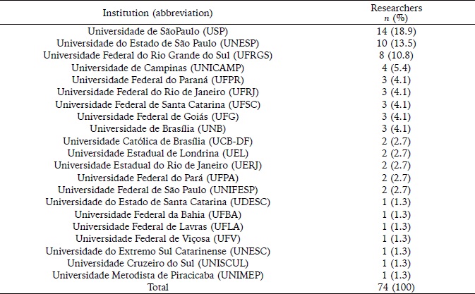 In terms of institutional distribution, the largest numbers of researchers with productivity grants are located at the Universidade de São Paulo (18.9%) and Universidade Federal de São Paulo (13.5%). The larger number of researchers are from the state of São Paulo, as shown in Table 3. Of the institutions with researchers who have productivity grants, 67 (90.5%) are public, and only 7 (9.5%) are private institutions.