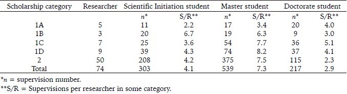 Table 4 shows the distribution of mentored students by the category of scholarship. Researchers from category 1B supervised most students, with a mean of 6.7 per researcher. At the masters level, the highest can be found in category 1D (8.2) and for doctorates the largest number is in category 1C (5.1).