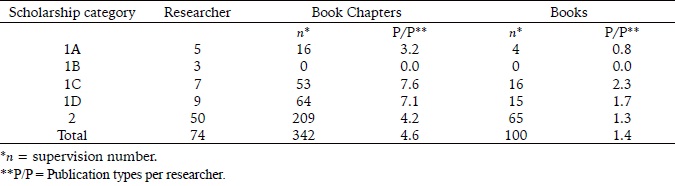 The CNPq Physical Education research fellows published a total of 100 books and 342 book chapters from 2007 to 2009, resulting in an average of 1.4 books and 4.6 book chapters published per researcher. Researchers in Category 1C and 1D performed above average: 2.3 books and 7.6 book chapters in category 1C, and 1.7 books and 7.1 book chapters for researchers classified in 1D. These values are higher than those presented by Cavalcante et al. (2008) in their study on CNPq research scholarship holders of the dentistry area, who published an average of 0.3 books and 1.9 book chapters over three years.