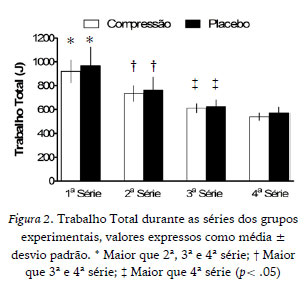 Os dados foram apresentados pela média e desvio padrão e foram analisados com o programa estatístico Statistical Package for the Social Sciences SPSS (versão 17.0). A normalidade dos dados foi previamente verificada por meio do teste Shapiro-Wilk. Para a avaliação da influência da compressão nas variáveis dependentes (PT e TT) utilizou-se ANOVA de medidas repetidas com dois fatores (compressão e placebo) em quatro níveis (séries 1ª, 2ª, 3ª e 4ª). Quando verificadas diferenças significantes foi utilizado como post hoc a análise de Bonferroni. Quando a esfericidade foi refutada os valores de probabilidade e os graus de liberdade foram ajustados pela correção de Greenhouse-Geisser. O nível de significância adotado foi de 5%.