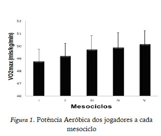 Quanto aos índices da potência aeróbica dos jogadores, no mesociclo I, o escore apresentado foi de 48.78 ± 0.96 mL/kg/min-1, no mesociclo II o escore médio foi de 49.20 ± 1.03 mL/kg/min-1, já no mesociclo III o escore médio dos jogadores foi de 49.72 ± 1.1 mL/kg/min-1, no mesociclo IV apresentaram o escore médio de 49.87 ± 1.21 mL/kg/min-1 e apresentaram então, no mesociclo V, o escore de 50.00 ± 1.09 mL/kg/min-1 (ver Figura 1).