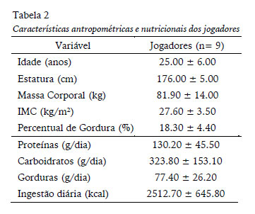 Com base em idades semelhantes entre os jogadores, verificou-se, por meio apenas do IMC, que os mesmos foram considerados com sobrepeso. No entanto, mesmo sabendo que em jogadores a massa muscular sobrepuja a massa de gordura, esse valor foi confirmado mediante o percentual de gordura, com valores considerados como acima da média pela literatura. Isso se deve pela nutrição inadequada de alguns macronutrientes pelos jogadores, em que a ingestão estava um pouco acima do recomendado, correspondendo a 20.8% proveniente de proteínas, 52.0% proveniente de carboidratos, e 27.2% de gorduras. Os dados encontram-se sumarizados na Tabela 2.