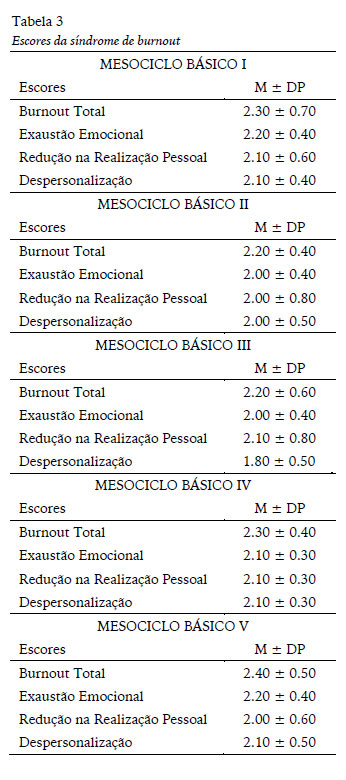 Quanto ao sentimento de Exaustão Emocional, 77% dos jogadores se encontraram na escala com a presença desse traço da síndrome relacionado com raramente a algumas vezes, representando escores baixos (2.10 ± 0.40), demonstrando não existir nenhuma influência significativa desta com o período preparatório dos jogadores. Acerca do sentimento de Despersonalização, os jogadores também apresentaram valores sempre baixos (2.00 ± 0.40), durante todo o período preparatório, em que um total de 44% dos jogadores pesquisados se encontrava na categoria quase nunca a raramente, enquanto 56% apresentam escores indicativos para raramente para algumas vezes. Sobre o ao sentimento de Redução na Realização Pessoal, 56% dos jogadores apresentam escores de 2.00 ± 0.70, que indicam raramente para algumas vezes, e demonstram não existir nenhuma grande influência desta variável no período preparatório dos jogadores. Para Burnout total, 56% dos sujeitos apresentam escores de 2.30 ± 0.50, indicativo que os colocam na escala entre raramente para algumas vezes (ver Tabela 3).
