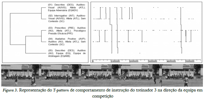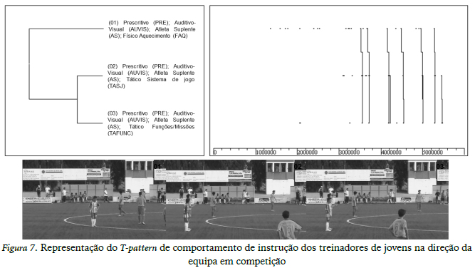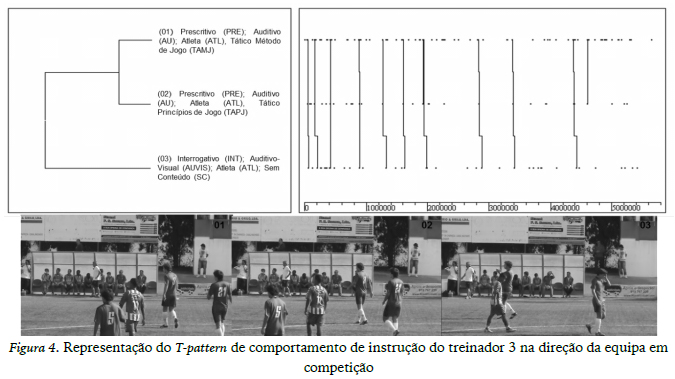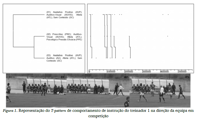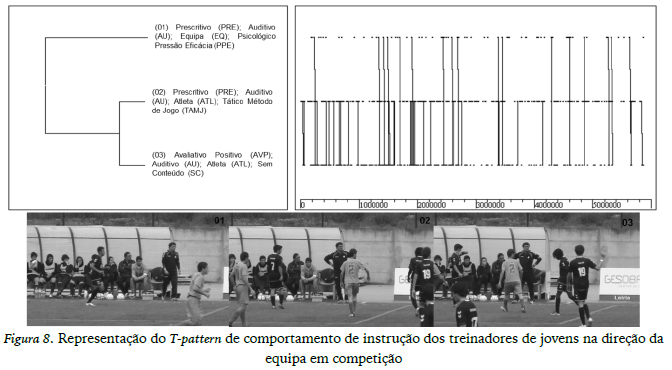 De acordo com os T-patterns encontrados, pudemos verificar sequências temporais de comportamentos de instrução em que os treinadores de jovens têm como principais preocupações os aspetos táticos e psicológicos, seguindo-se informação com o objetivo de avaliar positivamente os comportamentos e execuções técnico-táticas dos atletas (Santos & Rodrigues, 2008; Santos et al., 2012, 2013).
