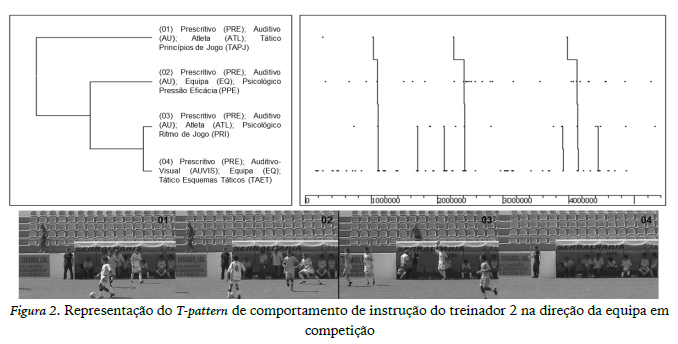 O T-pattern de comportamento da figura 2 representa a sequência temporal de dados com mais configurações de entre os padrões encontrados para o treinador 2, sendo também o que ocorre num maior número de vezes (3 repetições). O padrão inicia (01) com a prescrição (PRE) ao atleta (ATL) de informação sob a forma auditiva (AU) e com conteúdo relativo aos princípios específicos de futebol (TAPJ), sendo solicitado de seguida (02) à equipa uma maior eficácia na resolução das situações de jogo (PPE). Posteriormente (03) o treinador emite informação relacionada com a modificação do ritmo de jogo (PRI) e (04) a prescrição (PRE) de indicações relativa aos esquemas táticos (TAET). De salientar que a sequência temporal das duas últimas configurações ocorrem isoladamente em mais quatro situações que a totalidade do T-pattern. Tal facto deve-se ao treinador, em alguns momentos dos jogos observados, ter solicitado a rápida marcação dos lançamentos de linha lateral para poder aproveitar a momentânea desorganização defensiva do adversário.