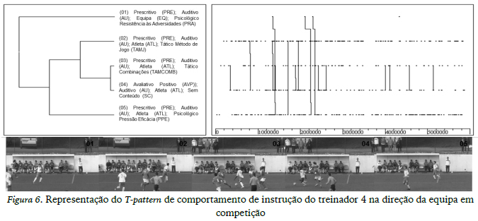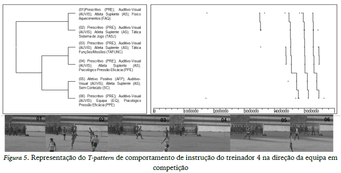 Registamos com o treinador 4 o número de ocorrências mais elevado de T-patterns de comportamento de instrução na direção da equipa em competição (n= 105). Os padrões referidos têm um máximo de seis configurações e 4 níveis de relação hierárquica.