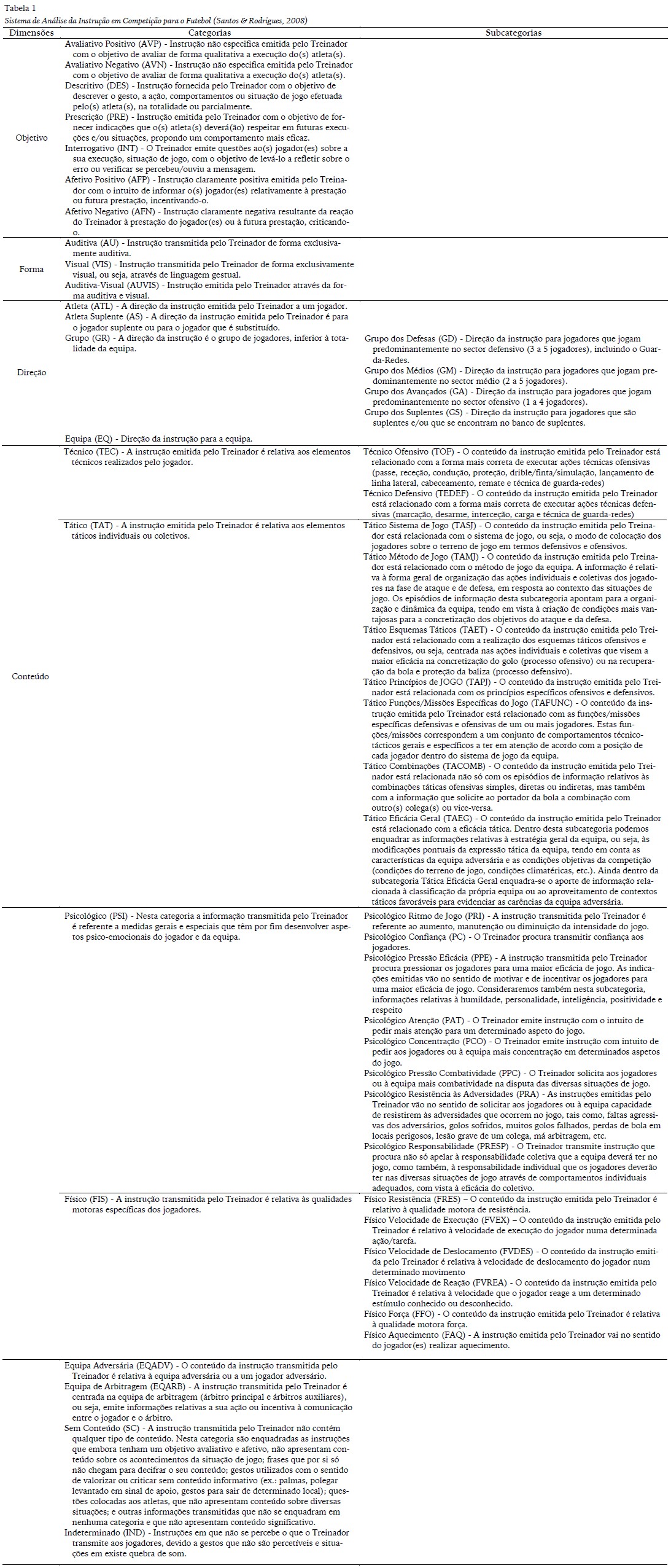 O instrumento utilizado para codificar os comportamentos de instrução dos treinadores em competição foi o Sistema de Análise da Instrução em Competição para o futebol - SAIC (Santos & Rodrigues, 2008); ver Tabela 1.