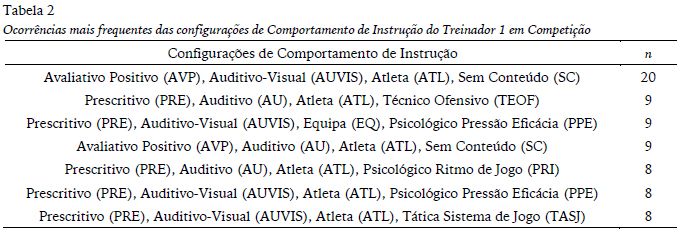 As configurações de comportamento de instrução com mais ocorrências são direcionadas ao atleta (ATL), recorrendo à comunicação auditiva (AU) e auditiva-visual (AUVIS). O comportamento de instrução com mais frequência de ocorrência (n= 99) avalia positivamente a execução dos atletas (AVP). Os treinadores emitem também informação com o conteúdo tático (TAT) e psicológico (PSI) (Tabela 3).