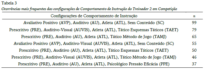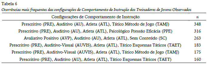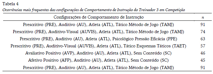 Na tabela 4 podemos verificar que a configuração de comportamento de instrução com mais ocorrências (n= 91) é relativa à prescrição de informação (PRE), sob a forma auditiva (AU), direcionada ao atleta (ATL) e com conteúdo relativo ao método de jogo da equipa (TAMJ). As restantes configurações com mais ocorrências têm conteúdo tático (TAT) e psicológico (PSI), direcionada ao atleta (ATL), recorrendo a comunicação auditiva (AU) e auditiva-visual (AUVIS). As duas últimas configurações têm o objetivo avaliativo positivo (AVP) e afetivo positivo (AFP), relativamente à execução e comportamento dos atletas.