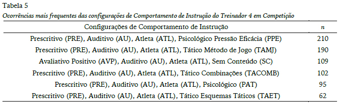 Na tabela 5, podemos verificar que a configuração com mais ocorrências (n= 210) tem como objetivo prescrever informação (PRE) que procura pressionar os jogadores para uma maior eficácia na resolução das situações de jogo (PPE), direcionada ao atleta (ATL) e sob a forma auditiva (AU). As restantes configurações de comportamento de instrução direcionam a informação ao atleta (ATL), sob a forma auditiva (AU) e tem conteúdo tático (TAT) e psicológico (PSI). De salientar o terceiro comportamento de instrução com mais ocorrências que é relativo a avaliação positiva (AVP) da execução e comportamento dos atletas.