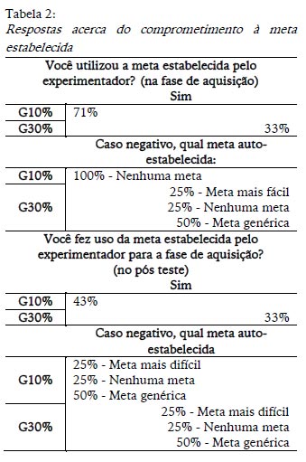 Os resultados da análise do comprometimento à meta estabelecida são apresentados na Tabela 2.
