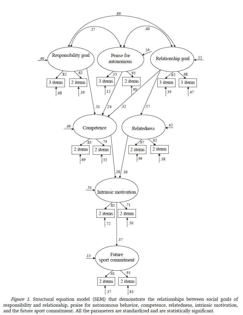 On the basis of the studies revised, it has been noted that commitment to sport is influenced by the social context that surrounds an athlete. Scanlan, Simons, Carpenter, Schmidt, and Keeler (1993) define commitment to sport as a psychological disposition which represents the desire and decision to continue to participate in sport. This is determined by the level of enjoyment, personal investments, involvement opportunities and social constraints, as well as social support (Scanlan, Russel, Beals, & Scanlan, 2003). In this respect, in the context of physical education and in line with this study, Giménez, Estrada, Río, and Mesa (2012) reaffirm that the responsibility and relationship goals can determine satisfaction of the basic psychological needs, and that they should also be considered along with other social factors. Likewise, these authors found that the psychological mediators, relatedness and perceived competence, positively predicted intrinsic motivation, which in turn predicted intention to do physical activity and sport in the future. In line with these studies and others (Cecchini-Estrada, González-Mesa, Méndez-Giménez, & Fernández-Río, 2011; Moreno-Murcia, Hernández-Paños, & González-Cutre Coll, 2009), a structural regression model was designed where it was hypothesized that the social responsibility and relationship goals, along with praise for autonomous behavior would positively predict satisfaction of the basic psychological needs, which would predict intrinsic motivation, which in turn would predict future commitment to sport in adolescent athletes.