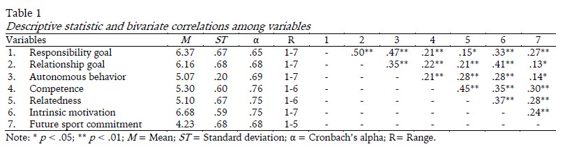 The descriptive statistics in Table 1 revealed that the responsibility goal had a higher value than the relationship goal. While praise for autonomous behavior scored an average value of 5.07. Perceived competence was valued higher than relatedness. Intrinsic motivation had a mean value of 6.68 and future commitment showed a mean value of 4.23. In the correlation analysis it was observed that all variables studied correlated positively and significantly with each other.