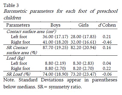 Table 3 shows the median and standard deviation values, and symmetry ratios of the variables for each foot of the children aged 45 years. No statistical differences were observed between the surface of the left and right feet, or between feet loading. We found a little negative effect size of the contact surface area between the left foot and right foot of the boys (d Cohen = -0.16; p= 0.71) and of the girls (d Cohen = -0.07; p= 0.34) and we found also a little positive effect size of the load between the left foot and right foot of the boys (d Cohen = 0.12; p= 0.60) and of the girls (d Cohen = 0.54; p= 0.15).