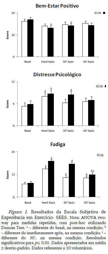 De acordo com o instrumento SEES, após a prática do exercício físico na condição de hipóxia, os voluntários ficaram fadigados por um maior espaço de tempo e apresentaram maiores níveis de distresse psicológico, que significaria um aumento negativo do estresse, acompanhados de uma diminuição do bem-estar, que pode estar intimamente relacionado as condições estressantes as quais os sujeitos foram submetidos. Essas dimensões tiveram o retorno dos scores aos valores basais somente 60 min. após o término do exercício, momento em que os questionários foram aplicados fora da câmara normobárica, sugerindo que estes valores podem estar relacionados com a condição de hipóxia a que os voluntários estavam mesmo com o cessamento do exercício. Utilizando o mesmo instrumento, Giampá et al. (2012) mostraram o mesmo comportamento das dimensões do referido questionário, porém os participantes realizaram exercício físico até a exaustão voluntária máxima, mostrando que a intensidade do exercício não é capaz de interferir em tais respostas.