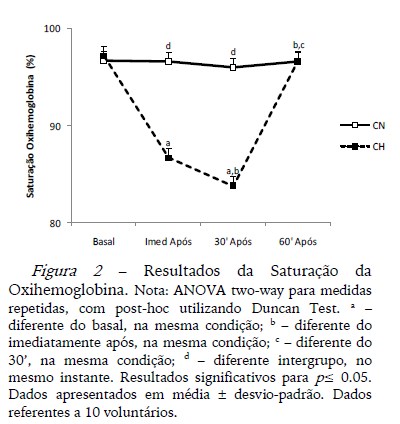A figura 2 apresenta os dados da saturação da oxihemoglobina a partir da oximetria de pulso. Na condição normóxia não foi observado diferenças significativas, no entanto, na condição de hipóxia é possível observar que imediatamente após houve uma diminuição deste parâmetro que perdurou por até 30 min. Além disso, observou-se que no momento 60 min. houve uma recuperação desta variável. A comparação inter-grupo demonstrou que o momento imediatamente após e 30 min. são diferentes onde a condição normóxia demonstrou maiores porcentagens de saturação de oxigênio quando comparado com a condição de hipóxia.