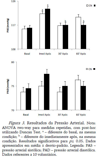 Em relação a variável pressão arterial, tanto a sistólica como a diastólica apresentaram comportamento similar em ambas as condições experimentais, onde é possível observar um aumento após a realização do exercício da pressão arterial sistólica e nenhuma diferença significativa na pressão arterial diastólica. Tal comportamento já está bem descrito na literatura, onde podemos encontrar que o exercício aeróbio praticado por jovens saudáveis produz um aumento na pressão arterial sistólica, sem alterações na pressão arterial diastólica imediatamente após o término da atividade. Cessado o exercício físico, é amplamente elucidado que este possui um efeito hipotensor após a sua realização, com conseqüente diminuição da pressão arterial sistólica (Duncan et al., 2014), comportamento que também foi observado em nosso estudo, onde verificamos que no instante 30 min após o término do exercício físico os valores de pressão arterial sistólica foram similares ao instante que antecedeu o exercício.