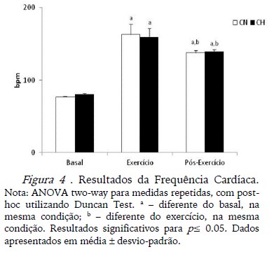 Durante todos os testes, a monitoração contínua da frequência cardíaca foi realizada. O experimento da CH foi realizado com intervalo de uma semana após o da CN, iniciando no período da tarde por volta das 15 horas e finalizando às 16:30 horas.