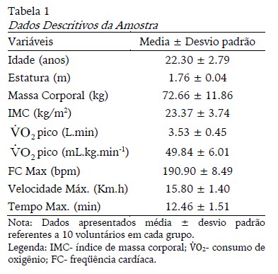 A tabela 1 apresentada os dados referentes à análise descritiva da amostra referentes a idade, estatura, massa corporal e índice de massa corporal, bem como os resultados do teste ergoespirométrico realizado até a exaustão voluntária máxima no momento basal. Os parâmetros referentes ao consumo de oxigênio são apresentados em valores absolutos (litros/minuto) e em valores relativos (considerando a massa corporal total). Além disso, são apresentados os valores máximos da velocidade, da frequência cardíaca e do tempo.
