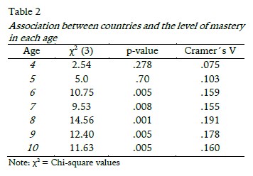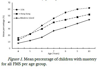 It is noteworthy that the curriculum proposal of China is directed to children older than the 6/7 years old, so after this age we would find significant increments in the number of children with mastery. Children from USA presented the highest average percentage of children with mastery in all ages followed by children from Hong Kong - China and children from Madeira Island - Portugal respectively.