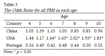 Table 3 presents the results of the odds-ratio analyses. In consonance with the descriptive results, children from US showed the highest chances to present mastery in the FMS at all ages (significant values from the six-year-old group to the ten-year-old group). Children from Hong Kong showed higher chances to present mastery while children from Madeira Island showed smaller chances. Nevertheless, the chances for children from these latter countries did not approach significant levels. Additionally, only the US presented equal or greater percentage of children with mastery in the FMS than the expected 60% - and it occurred only for older groups (9- and 10-year-old groups).