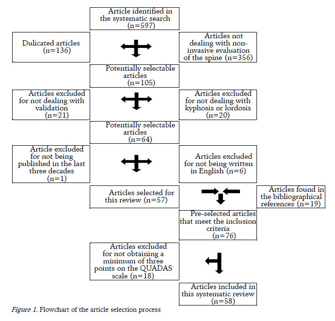 In April 2013, a systematic search was conducted for scientific articles in the following databases: Scopus, Science Direct, Pubmed and Medline. The search terms used were: Noninvasive instrument OR Non-invasive Monitoring OR Measurement OR Measurements OR Postural Assessment OR Postural Evaluation Methods OR Non-radiological Measures AND Spine Curvatures OR Lumbar Curvatures OR Thoracic Curvatures OR Thoracic Curve OR Lordosis Curve OR Thoracic Kyphosis OR Lumbar Lordosis OR Kyphosis OR Lordosis OR Postural Assessment AND Validation OR Validity OR Repeatability OR Reproducibility OR Reliability OR Accurate OR Accuracy. To be included in this systematic revision the articles found were required to meet the following inclusion criteria: (a) perform a non-invasive evaluation of the spinal curvatures; (b) perform an evaluation in the sagittal plane of thoracic kyphosis or lumbar lordosis; (c) evaluate some validation aspect; (d) to be written in English and (e) to have been published in the last three decades. All the search, selection, quality evaluation, reading and data extraction procedures were carried out by two independent evaluators. In the case of any divergence of opinion between the evaluators, a third evaluator was invited to analyze the article.