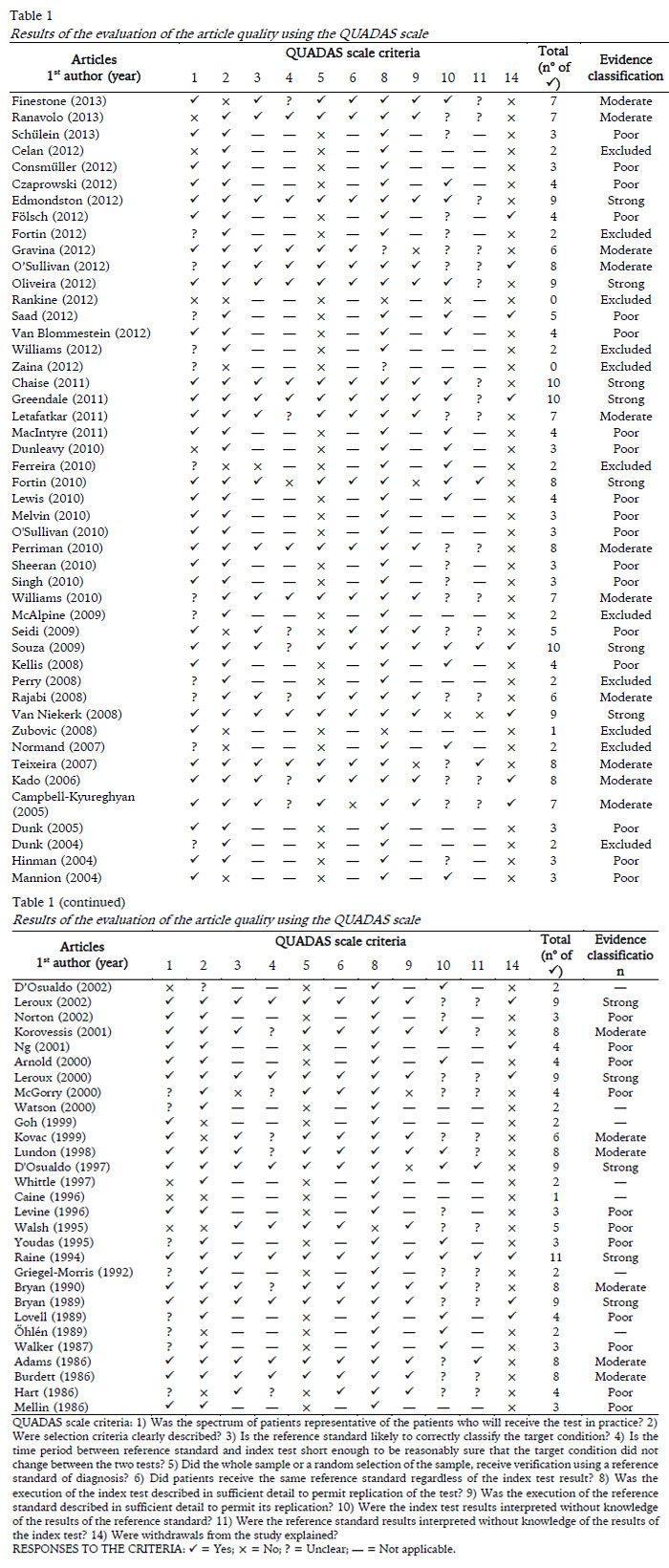 The pre-selected articles were evaluated regarding their methodological quality using the QUADAS scale (Table 1). Of the 76 evaluated articles, 18 were excluded because they did not obtain the stipulated minimum of three points on the scale, thus 58 articles were finally included in this systematic review. Regarding the quality of the scientific evidence in the articles, 29 presented poor scientific evidence, 17 moderate evidence and 12 strong evidence.