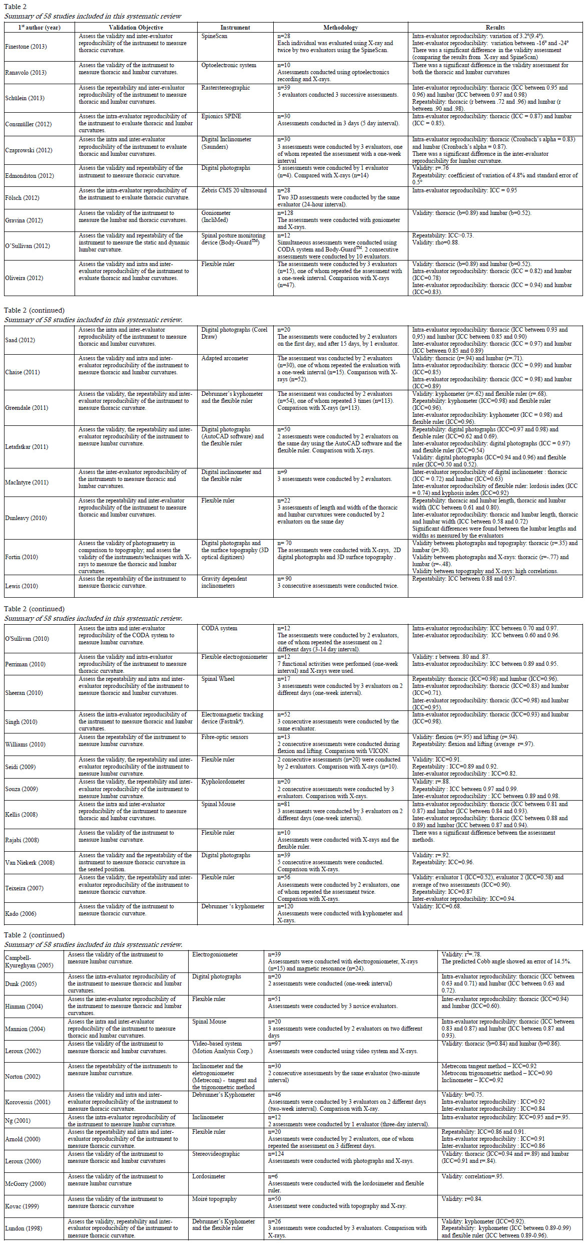 Table 2 presents the validation objective, the instrument used, the methodology and the results for the 58 articles included in this review. The validation objective shown is not necessarily the primary objective of the corresponding paper but instead that which deals with aspects of validation in relation to non-invasive instruments used to evaluate spinal posture in sagittal plane.