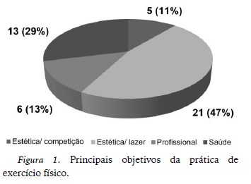 O estudo foi realizado com 45 mulheres de 21 a 71 anos (média = 35,40±11,96 anos). Para responder aos objetivos de pesquisa, neste instante são abordados os dados relativos aos três temas fundamentais do estudo que são a saúde, o envelhecimento e o exercício físico. Na figura 1, demonstram-se os objetivos da prática do exercício físico de acordo com as entrevistadas. Quanto a essa questão, considera-se que as voluntárias foram orientadas a indicar o motivo mais relevante que fundamenta à experiência atual com o exercício físico. Observa-se uma maior incidência de interesses associada à produção estética do corpo como forma de lazer. Na sequência, os motivos de maior regularidade são “cuidados com a saúde”, “profissão” e “produção estética do corpo para competição”.
