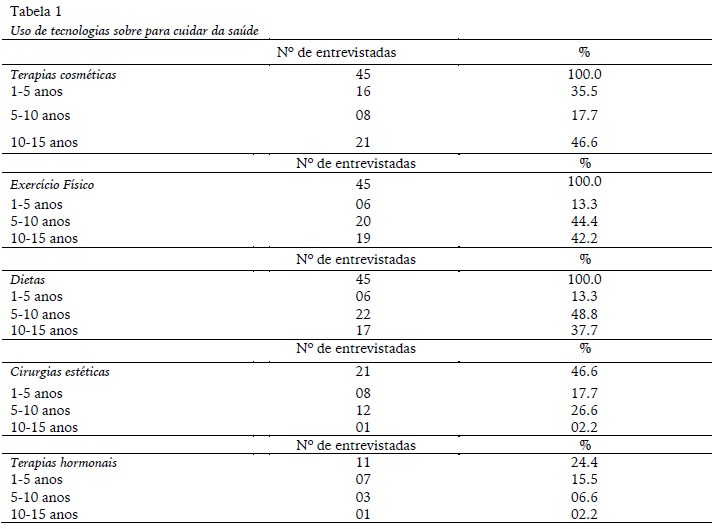 No grupo estudado, o medo de envelhecer aparece em 25% das declarações obtidas sobre envelhecimento. Não obstante, todas as participantes manifestaram o tema de maneira velada, dado que permite compreender o envelhecimento como é um fenômeno de significativa importância para as entrevistadas. Entre os motivos que justificam tal situação pode-se citar o valor conferido ao cuidado com a saúde e à produção estética corporal que pode ser evidenciado na figura 1 e na tabela 1.