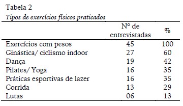 Na tabela 2 descreve-se os tipos de exercícios físicos praticados levando em consideração o histórico das participantes. Para essa questão, é importante destacar que se admitiu mais de uma resposta possível. O treinamento com pesos aparece como preferência para todas as entrevistadas, seguido pela ginástica e o ciclismo indoor, dança, pilates e yoga, práticas esportivas de lazer, corrida e lutas. Estes dados refletem a importância concedida à produção estética corporal via aumento de massa muscular e modificação das formas. Nesse sentido, T. (22 anos, estudante) considera que “O músculo é tudo de bom! Por mim todos nós éramos musculosos, O músculo é beleza e deixa tudo no lugar”. Por outro lado, observa-se a ênfase concedida às atividades oferecidas no espaço fechado das academias, fato conveniente visto que a sua estrutura é pensada para oferecer variadas atividades com o máximo de controle de tempo e espaço (Sassatelli, 1999).