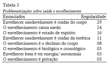 Na tabela 3, é possível observar que a relação saúde e envelhecimento é pensada de diferentes formas. Na realidade investigada não existe apenas uma única maneira de perceber o fenômeno. Ao mesmo tempo, destaca-se o fato de que, para as Hebes contemporâneas, a relação saúde e envelhecimento não está norteada apenas pelo discurso biológico que tende associar a velhice a alterações fisiológicas negativas.