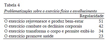 As tabelas 4 e 5 referem-se aos enunciados extraídos sobre a relação exercício físico e envelhecimento e sobre as problematizações produzidas sobre saúde. As Hebes contemporâneas se referiram ao potencial que o exercício físico tem de rejuvenescer o corpo não apenas pelo fortalecimento estrutural, mas pela produção de um bem-estar que expressa a recuperação de capacidades estéticas e físicas.