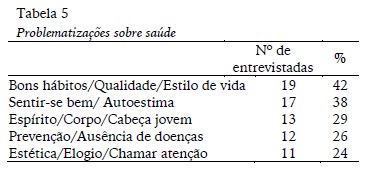 Na tabela 5, encontram-se as categorias que representam as formas de problematizar a saúde, produzidas pelo grupo estudado. Vale ressaltar que estas categorias encontram-se relacionadas ao que foi exposto na tabela 3 no tocante às relações significativas entre saúde e bons hábitos, bem-estar, autoestima, ter um espírito jovem e estética corporal.