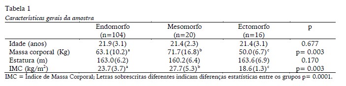 Na Tabela 1 estão apresentadas as características gerais da amostra. Foram observadas diferenças estatísticas na massa e no Índice de Massa corporal entre os três: endomorfo e mesomorfo; endomorfo e ectomorfo; mesomorfo e ectomorfo.