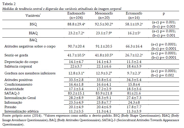 Existem diferenças entre os grupos delineados pelos perfis somatotípicos acerca das variáveis dependentes combinadas, no caso os componentes da imagem corporal F(36, 375)= 1.81, p= 0.0001; Wilk de Λ = 0.623, ηp2= 0.146. Acompanhamento de ANOVAs univariadas mostraram que o perfil somatotípico tem efeito estatisticamente significativo apenas sobre os componentes da imagem corporal expressos pelos instrumentos BSQ (F(3, 138)= 6.1; p= 0,001; ηp2= 0.11), BIAQ (F(3, 138)=4.7; p= 0.003; ηp2= 0.94), “atitudes negativas sobre o corpo” (F(3, 138)=7.9; p= 0,0001; ηp2= 0.18) “sentir-se gorda” (F(3, 138)=10; p= 0.0005; ηp2= 0.18), “depreciação do corpo” (F(3, 138)=2.6; p= 0,05; ηp2= 0.54), “gordura nos membros inferiores” (F(3, 138)=1.7; p= 0.005; ηp2= 0.36), “atratividade” (F(3, 138)=2.8; p= 0.05; ηp2= 0.57). O teste de Tukey identificou diferenças com significância estatística entre dois pares de grupos, GEC (ectomorfo) e GEN (endomorfo) e GEC e GM (mesomorfo), para os escores médios do BSQ, BIAQ, “atitudes negativas”, “sentir-se gorda” e “gordura nos membros inferiores” detalhadas abaixo e resumidas na Tabela 2: