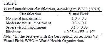 Subjects aged between five and 15 years (the age range that the scale is proposed review) and with low vision (moderate or severe) were included in the study and were diagnosed according to the criteria of the World Health Organization (2010) (Table 1), with at least one query for diagnosis ophthalmologist. Excluded subjects included those with heart and/or neurological based diseases (cerebral palsy, West syndrome) or hearing impairments; congenital malformation of physical order; severe cognitive deficit (no understanding of the simple orders of the test); or visual acuity to 3/60 (0.05) - blindness.