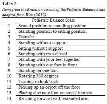 In the reviewed literature, few publications were found about the application of the Pediatric procedures performed. Thus, arises the need for tools to identify the problems related to balance and allow the consolidation of the evaluation and for further therapeutic intervention.