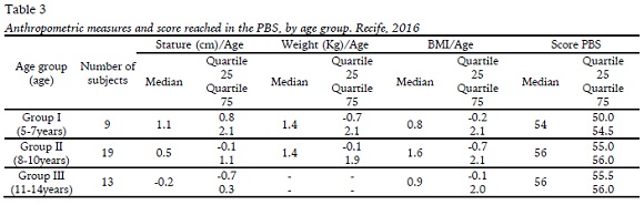 The results show a moderate correlation between the final score of the PBS and the age of the children and adolescents evaluated, the same was observed in the study Butz, Sweeney, Roberts and Rauh (2015). This happens because the PBS scores do not follow a normal distribution pattern, especially in the older age groups in which most children/adolescents reached maximum score, or very close to the maximum in the test.