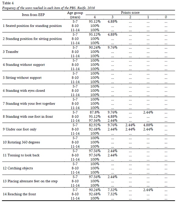 Regarding the performance of children and adolescents on the scale, it was found that in six of the 14 total items the PBS maximum score was achieved by all the children and adolescents: 4 (Standing unsupported), 5 (Sitting unsupported) 6 (Standing with eyes closed), 7 (Standing with feet together), 10 (Turning 360◦) and 12 (Retrieving objects off the floor). The frequency of the score achieved on each task of the PBS by age group is shown in Table 4.