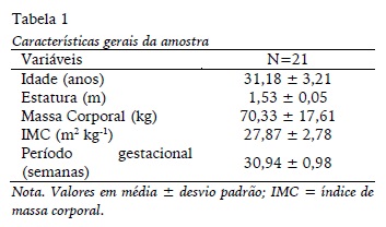 Todas foram submetidas a uma anamnese inicial com dados do pré-natal (idade gestacional, data provável do parto, primíparas), familiarização por três sessões com a atividade de hidroginástica, avaliação antropométrica e hemograma completo. O projeto de pesquisa foi aprovado pelo Comitê de Ética do Hospital Universitário Clementino Fraga Filho (HUCFF), da Universidade Federal do Rio de Janeiro, com o número de protocolo CAAE 43227115.4.0000.5257. Todos os sujeitos assinaram o termo de consentimento livre e esclarecido (TCLE). A Tabela 1 mostra as características gerais da amostra. As mulheres eram eutróficas ou sobrepeso e no terceiro trimestre de gravidez.