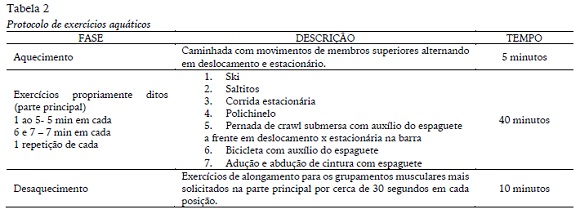 O protocolo de exercício físico aquático aplicado (Alberton et al., 2015) foi uma sessão de hidroginástica, com duração de 50 minutos. No início de cada sessão, foi realizado um aquecimento de 5 minutos com exercícios aeróbios dinâmicos sendo alguns estacionários e outros em deslocamento, com o objetivo de preparar os grupamentos musculares ao exercício propriamente dito. A parte principal da sessão de treino (aproximadamente 40 minutos) objetivou a melhoria ou manutenção da capacidade cardiovascular, da força muscular, da flexibilidade e da postura. Ao final um desaquecimento (5 minutos) com o objetivo de retomar a situação inicial do organismo sem causar-lhe danos como contraturas e dores musculares (Al Haddad et al., 2010). O protocolo aplicado teve a duração de 50 min e uma única sessão. Para o controle da intensidade na sessão de exercício, a percepção subjetiva de esforço foi verificada através da escala de BORG adaptada - CR 20(Neves & Doimo, 2007). A variação foi de 6 ("muito fraca") a 8 ("fraco") durante flexibilidade e exercícios de alongamento, enquanto era 13 (moderado), 15 ("forte") a 20 ("muito, muito forte ") durante o exercício aeróbico. Antes e após a sessão, foram verificadas a PA (por meio do esfigmomanômetro Hem 631- OMRON) e a FC pelo frequencímetro (Tabela 2).