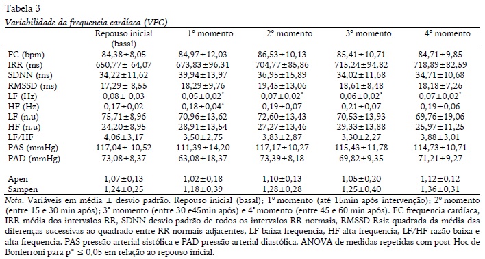 A Tabela 3 apresenta os índices da variabilidade da frequência cardíaca para as condições estudadas. A banda de LF (Hz) apresentou valores significativamente menores nas condições momentos pós-intervenção em comparação ao repouso inicial. Por outro lado, nas condições repouso inicial, a banda de HF foi maior que os valores basais (p=0,0008). Os outros índices da variabilidade da frequência cardíaca não mostraram diferenças.