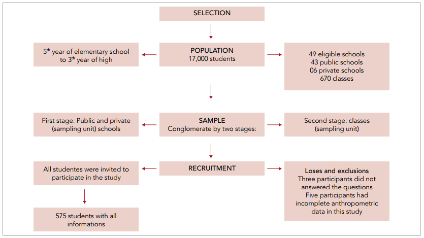 For the representativeness of the selected sample, the type of school (municipal, state, and private) and school grade were considered. Two stages were carried out for sample selection: the first stage considered the school, and the second stage considered the classes. The stratification criterion selected was the type of school in which schools with the largest number of grades were selected for the first stage. From the first stage, the second stage selected schools considering the density of classes per school. All students in selected classes were invited to participate in the study.