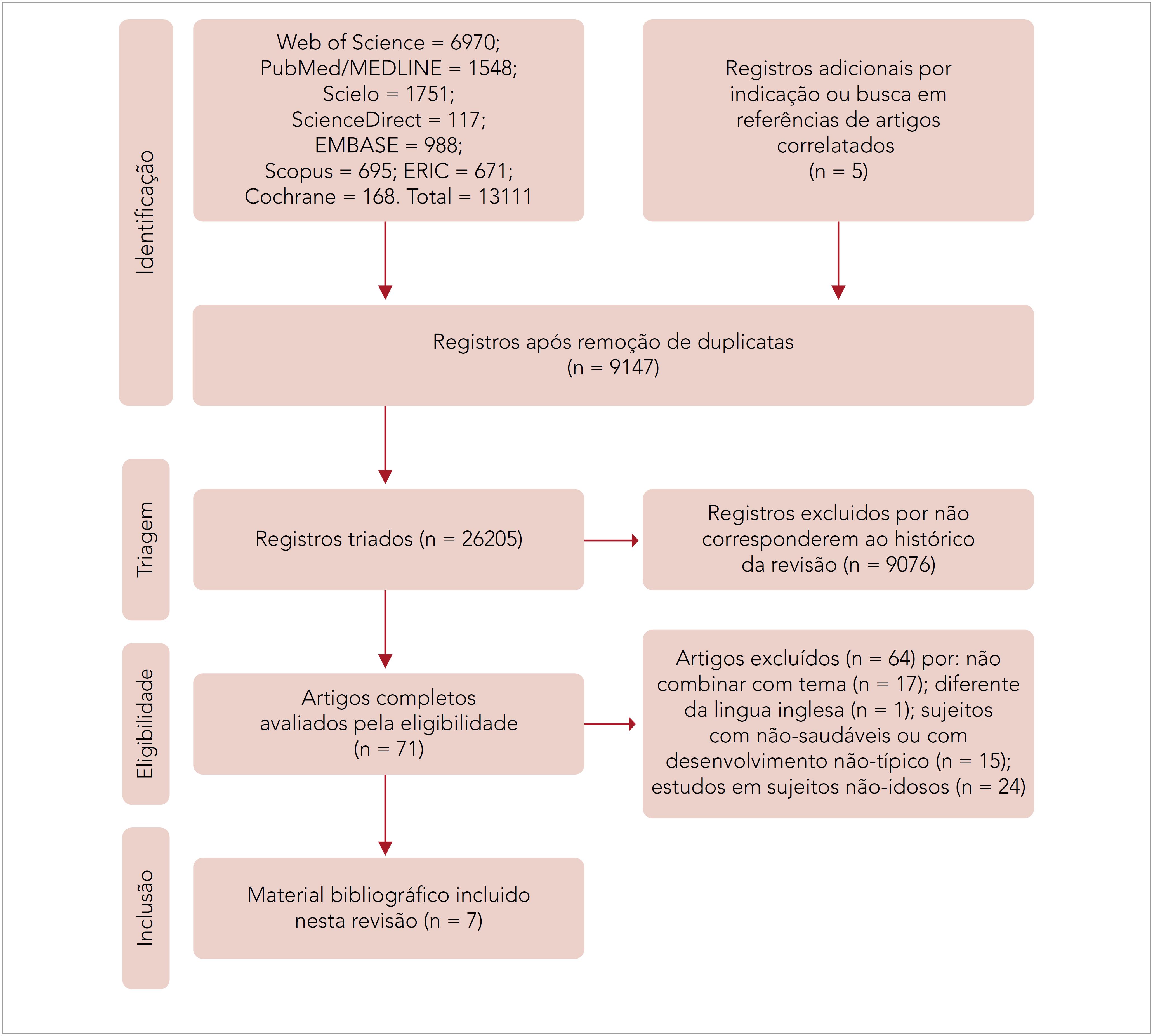 O processo de seleção do material bibliográfico finalizou com sete registros incluídos: seis artigos científicos de natureza observacional, um deles com amostra de indivíduos adultos e um capítulo de livro, ambos incluídos pela relevância e indicados por especialistas na área, como mostrado na Figura 1.