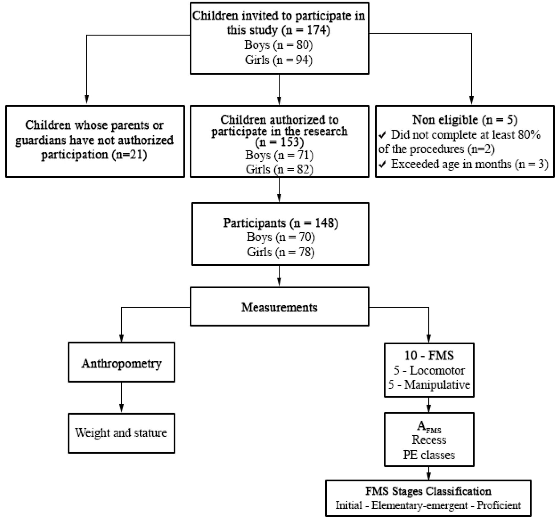This cross-sectional study was conducted at a private school, located in a suburban area of a city in Southeast Brazil. All children (n= 174) regularly enrolled in Elementary Education (1st to 5th grades) were invited to participate voluntarily, through an invitation letter and meetings with parents/guardians. Parents/guardians of 153 children agreed to participate in the study. The inclusion criteria for the study were: a) being between six and 10 years old; b) being apparently healthy without medical restrictions, clinical treatment, or taking medicine that could affect metabolism, appetite, or growth (checked with their parents/guardians); and c) without having motor restrictions (e.g., wheelchair users, cerebral palsy) or amputated body parts (both conditions observed by the researcher). Data were excluded from children who: a) did not complete at least 80% of the procedures; and b) were suffering from illnesses or physical limitations during the study. After applying the exclusion criteria, data from five children were excluded from the analysis. Therefore, 148 children were analyzed, 70 boys and 78 girls.